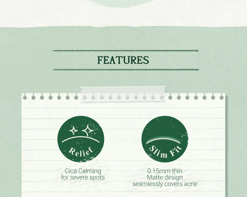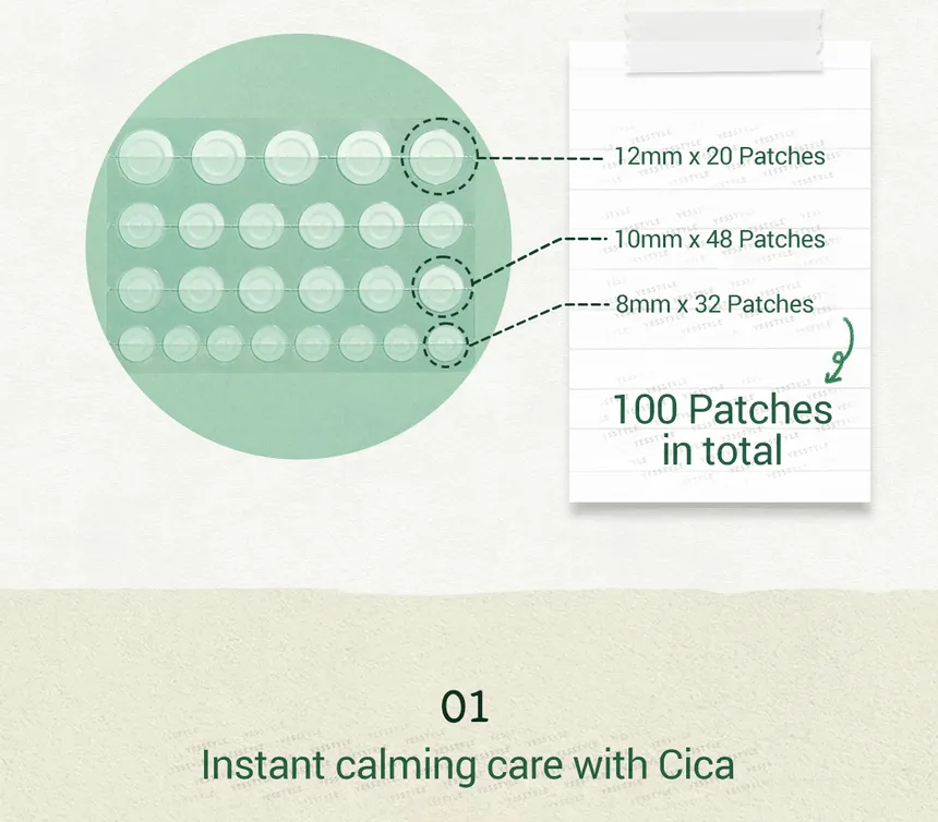 - Los parches ayudan a calmar la piel con cica, disminuyen el enrojecimiento y cubren imperfecciones.
