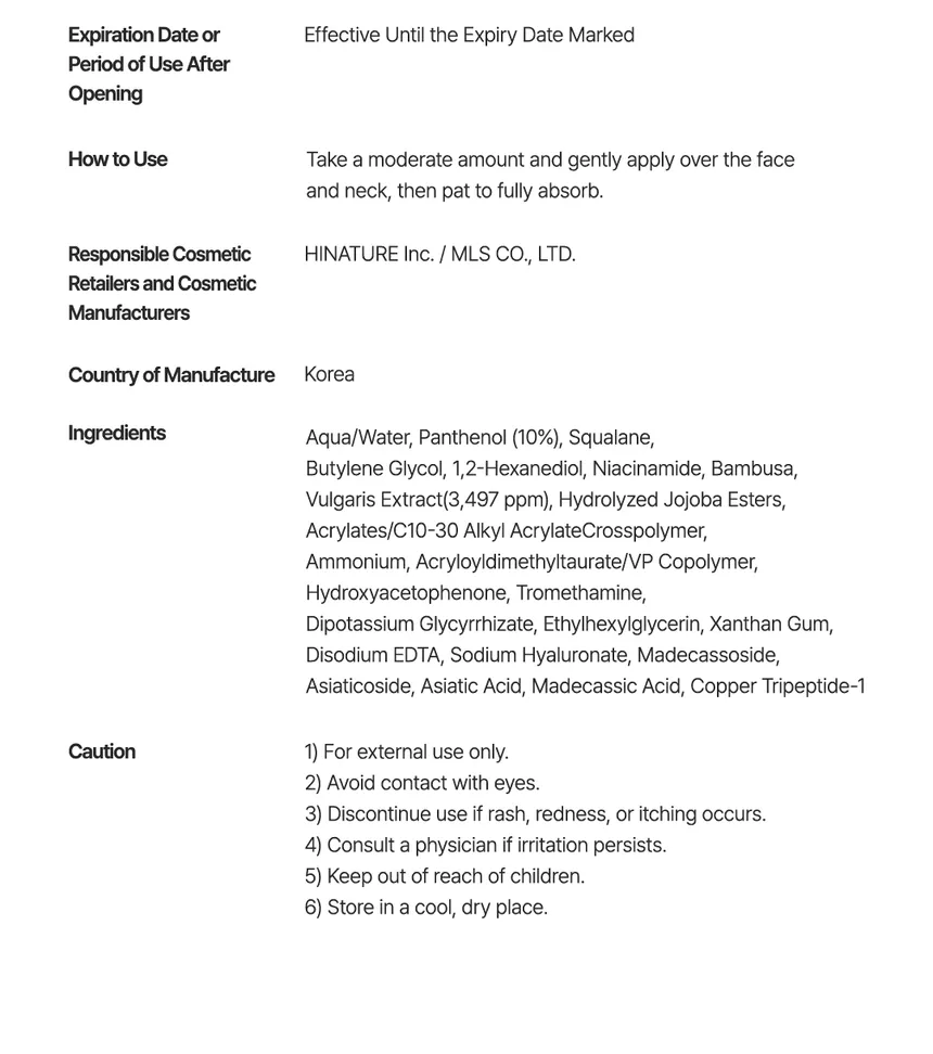 Water, Panthenol, Squalane, Butylene Glycol, 1,2-Hexanediol, Niacinamide, Bambusa Vulgaris Extract, Hydrolyzed Jojoba Esters, Acrylates/C10-30 Alkyl Acrylate Crosspolymer, Ammonium Acryloyldimethyltaurate/VP Copolymer, Hydroxyacetophenone, Tromethamine, Dipotassium Glycyrrhizate, Ethylhexylglycerin, Xanthan Gum, Disodium EDTA, Sodium Hyaluronate, Madecassoside, Asiaticoside, Asiatic Acid, Madecassic Acid, Copper Tripeptide-1